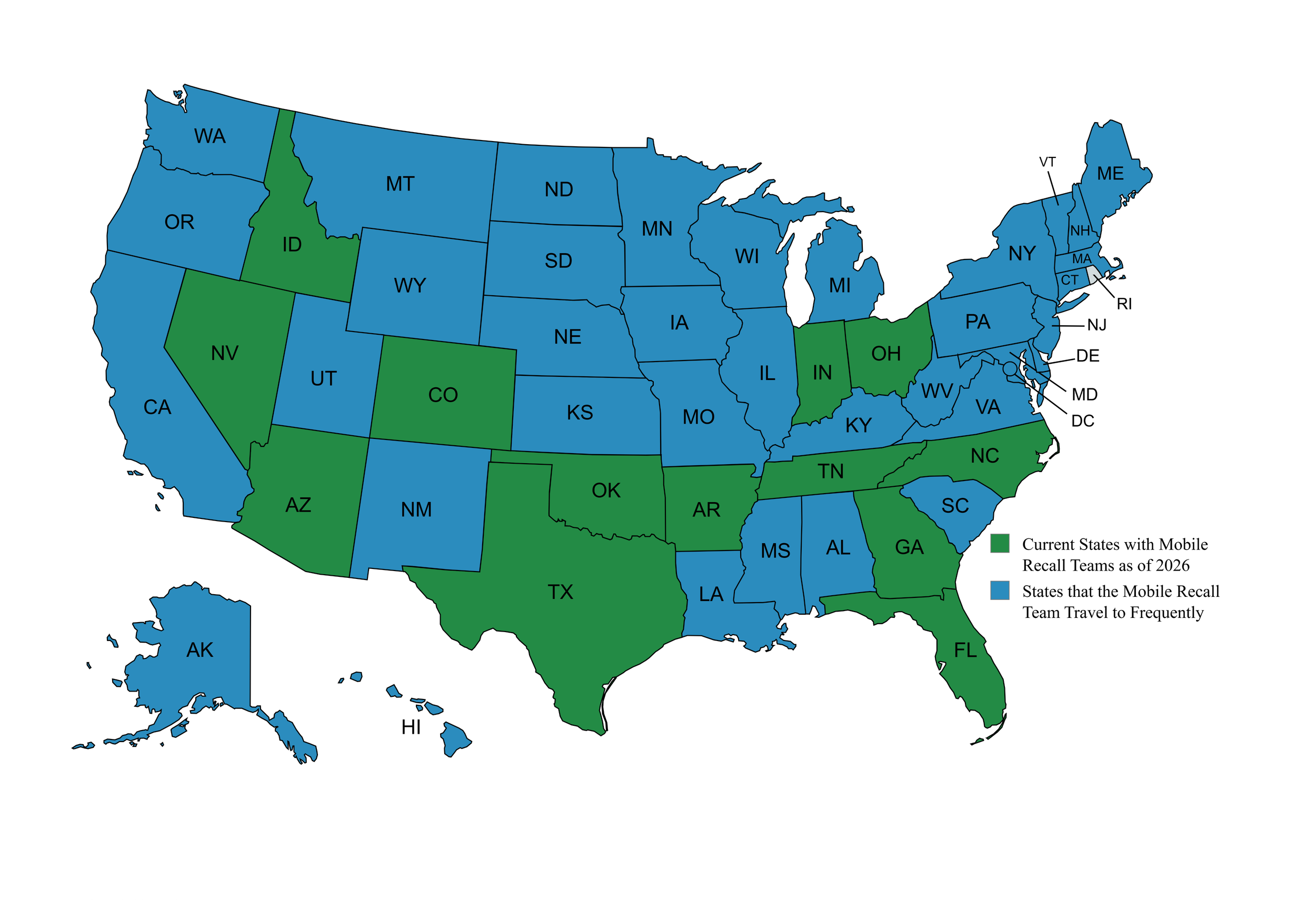 As of 2026, The Mobile Recall Team operates 15 teams across 12 states, with several teams providing nationwide travel for service.